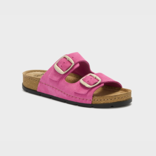 Ciabatta realizzata in pelle scamosciata con 2 cinturini regolabili, dalla forma raffinata e strutturata e dotata di plantare morbido.
