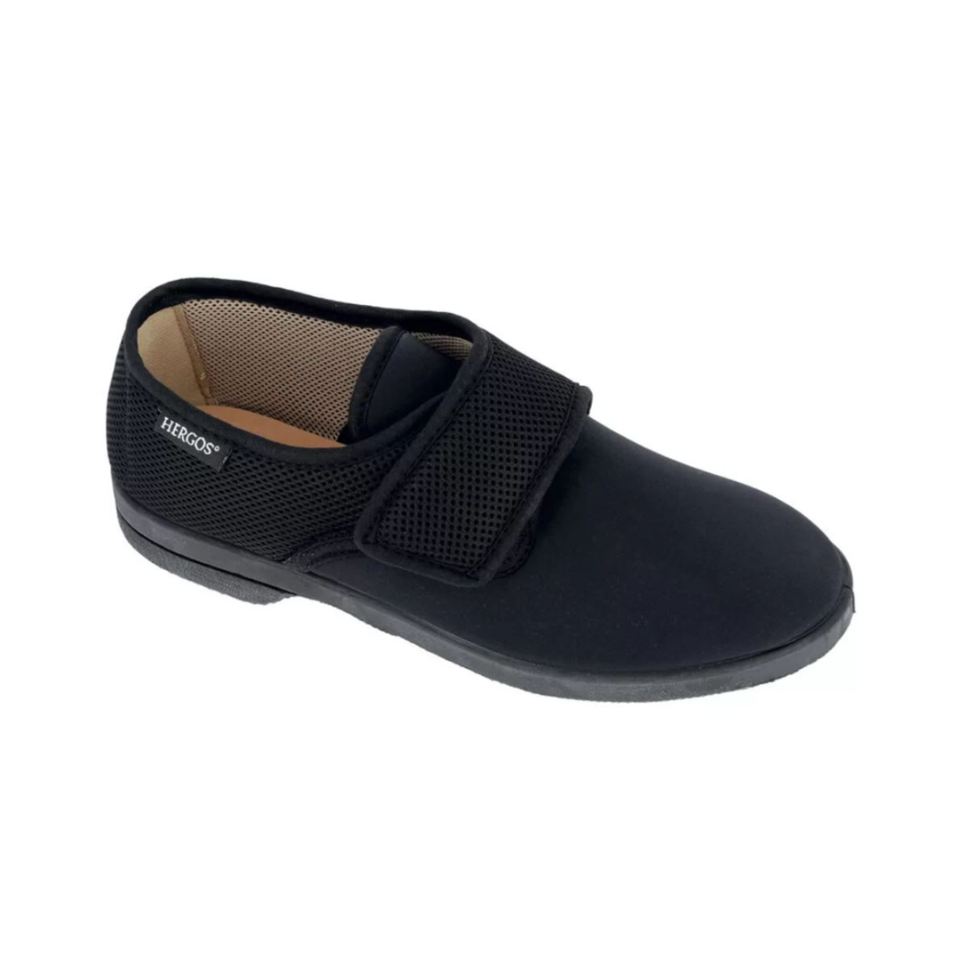 Calzatura adatta per la riabilitazione, fatta con una tomaia regolabile ed una suola antiscivolo. La calzatura è inoltre idonea per l’utilizzo di plantari su misura.