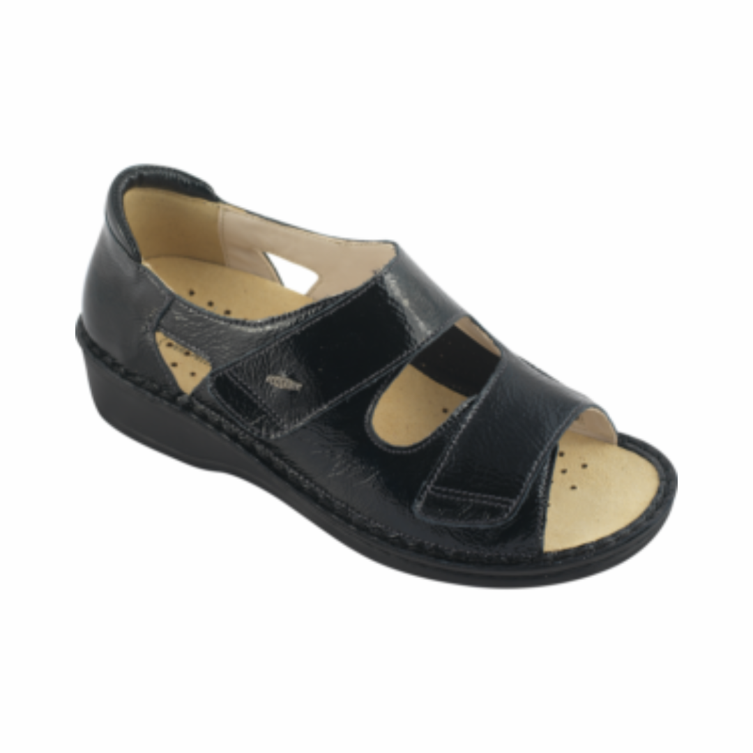 Sandalo a fasce con allacciatura in velcro e tallone chiuso. La calzatura è inoltre idonea per l’utilizzo di plantari su misura.