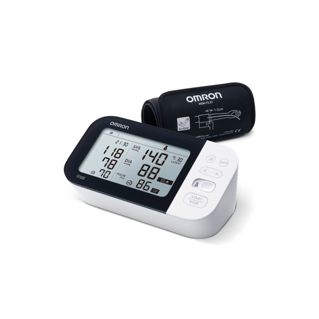 Misuratore da braccio che esegue tre misurazioni consecutive della pressione arteriosa a intervalli di 30 secondi, visualizza quindi la media per fornire un’indicazione più corretta della pressione. Può inviare i risultati allo smartphone via Bluetooth e conserva le letture della pressione arteriosa nell’applicazione OMRON connect.