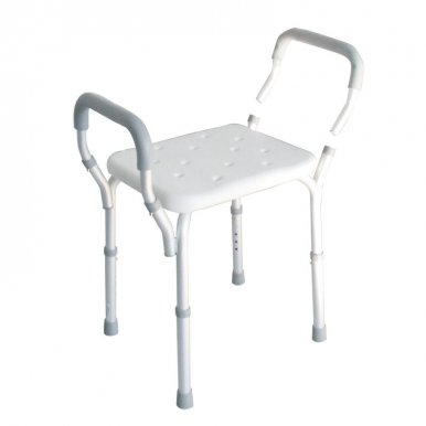 Sgabello da doccia con seduta forata per far scorrere l’acqua, altezza regolabile e braccioli laterali. Particolarmente indicato per chi ha difficoltà ad alzarsi o a sedersi ed ha bisogno di sicurezza nel momento della doccia.