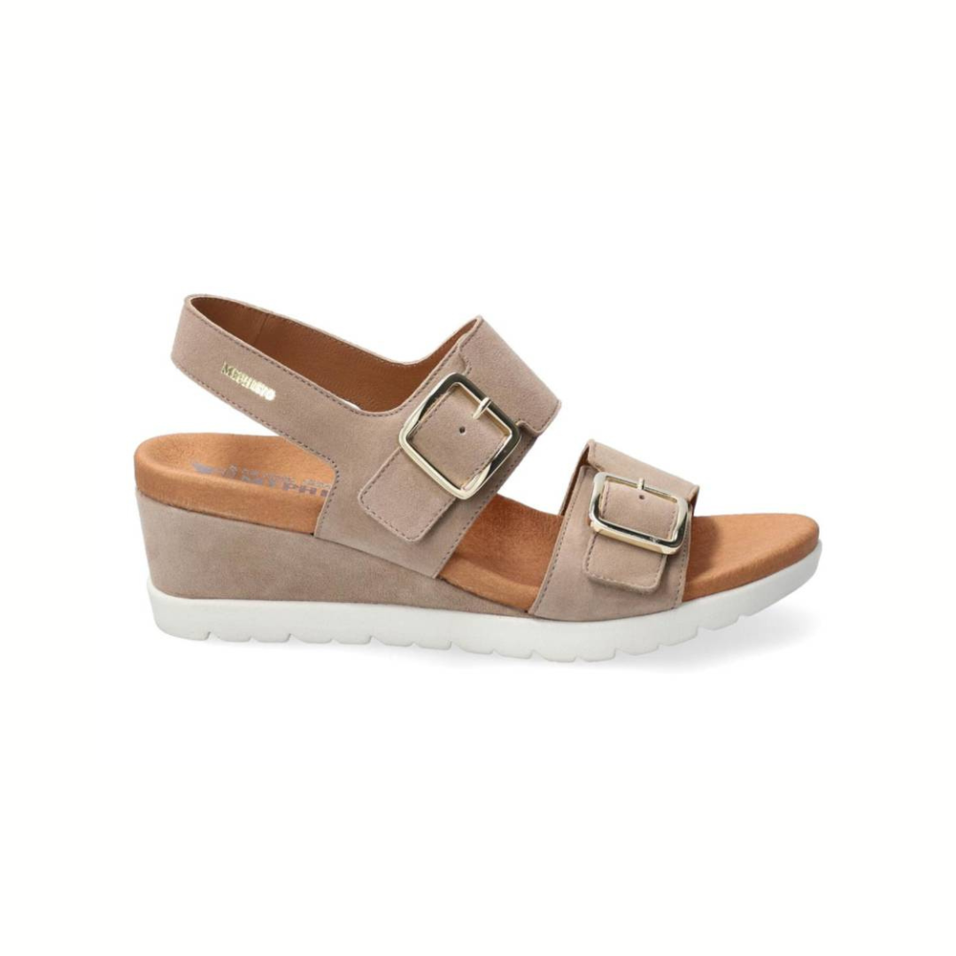 Sandalo con zeppa e fodera in pelle, le due fasce sono regolabili con velcro.